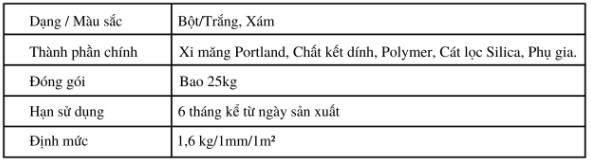 Cường độ bám dính: ~1 N/mm² (trên bề mặt bê tông đã làm ẩm).