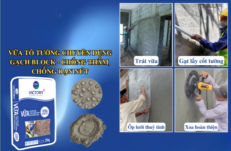 Trộn vữa: Trộn Vữa chống thấm gạch block Victory ACC theo tỉ lệ của nhà sản xuất bằng cối trộn hoặc máy trộn có vòng quay.