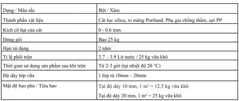 Vữa khô trộn sẵn chống thấm nghịch được phối trộn trên dây chuyền tự động, các bao sản phẩm có tính đồng nhất cao, nguyên liệu đầu vào sạch, cát được lọc sấy sàn chọn lọc hạt tương đồng, khi phối trộn có độ dẻo cao, dễ dàng thi công, ít rơi vãi, bám dính cao, có thể thi công bằng máy phun, thời gian lưu kho dài…