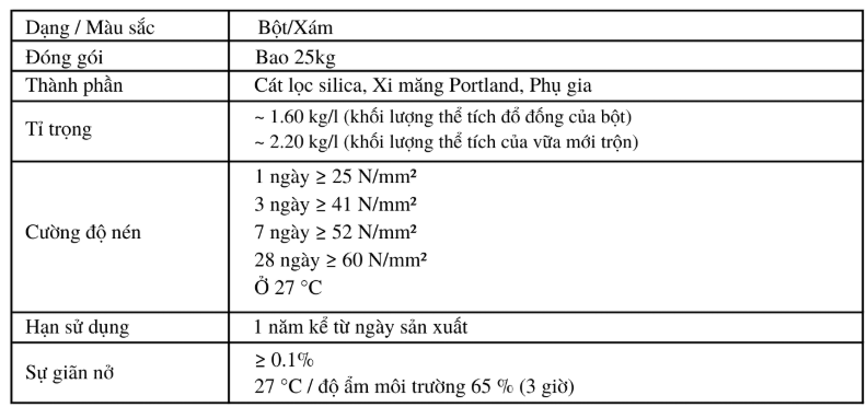 Thời gian đông kết: Thời gian ninh kết ban đầu ≥ 5 giờ, thời gian ninh kết sau cùng ≤ 12 giờ. 27 °C / độ ẩm môi trường 65 %.